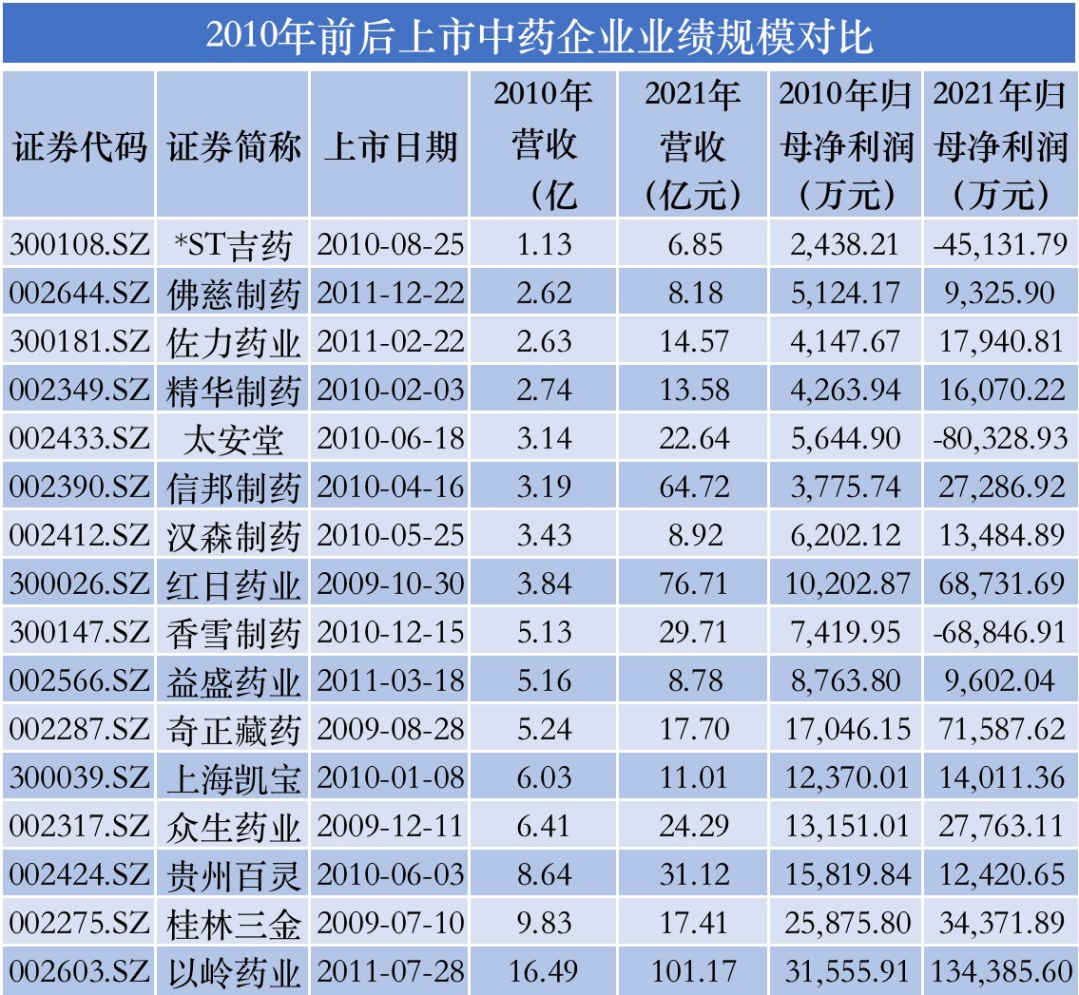 政策红利下,中药企业羽翼渐丰,2010年前后掀起A股上市潮。wind数据显示,仅2009年-2011年,上市的中药企业就达到16家,其中不乏以岭药业、太安堂、贵州百灵、桂林三金等知名药企。