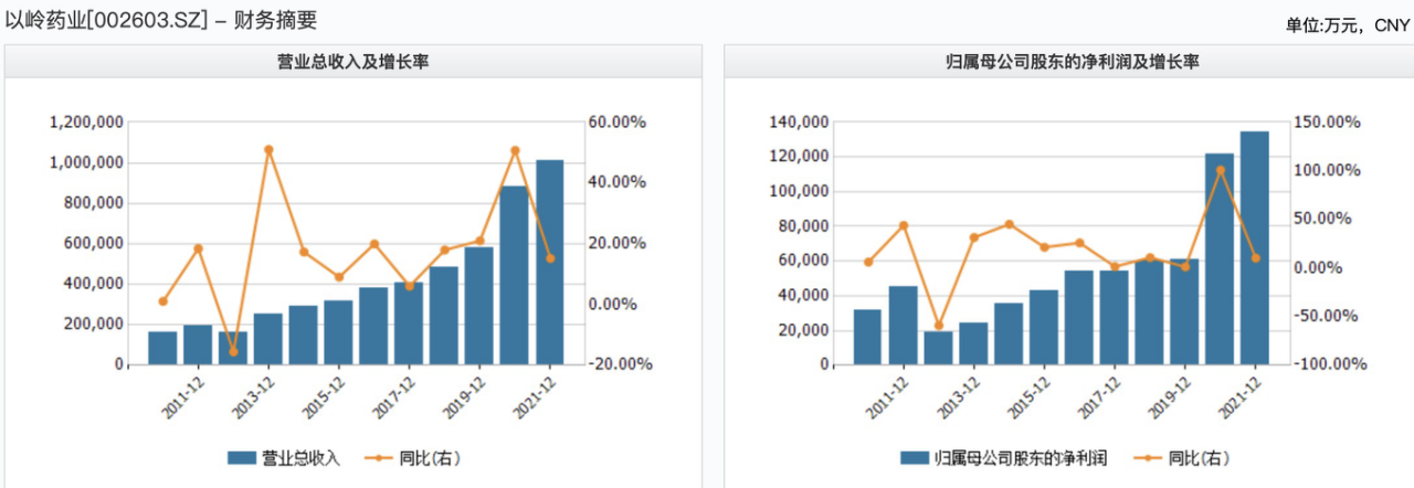具体来看,上市前的2010年,以岭药业营收16.49亿元,到2021年,已经增加至101.17亿元,11年翻了6倍余;归母净利润也从当初的3.16亿元成长至去年的13.44亿元。
