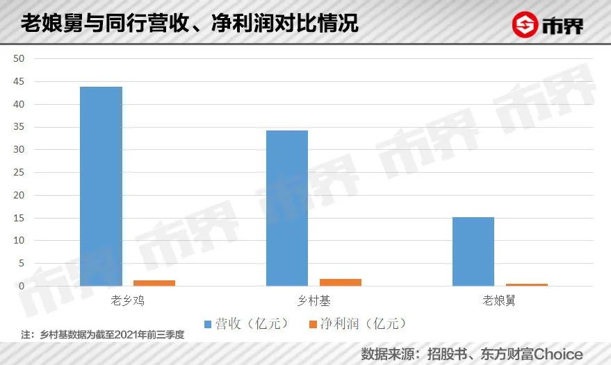 根据招股书,老娘舅的营收仅从2019年的12.22亿元增长至2021年的15.25亿元;同期净利润却从6517万元下滑至6299万元。反观2021年老乡鸡营收43.93亿元、净利润为1.35亿元;2021年前三季度乡村基营收为34亿元、净利润1.63亿元,收入规模分别是老娘舅的2.8倍和2.2倍。