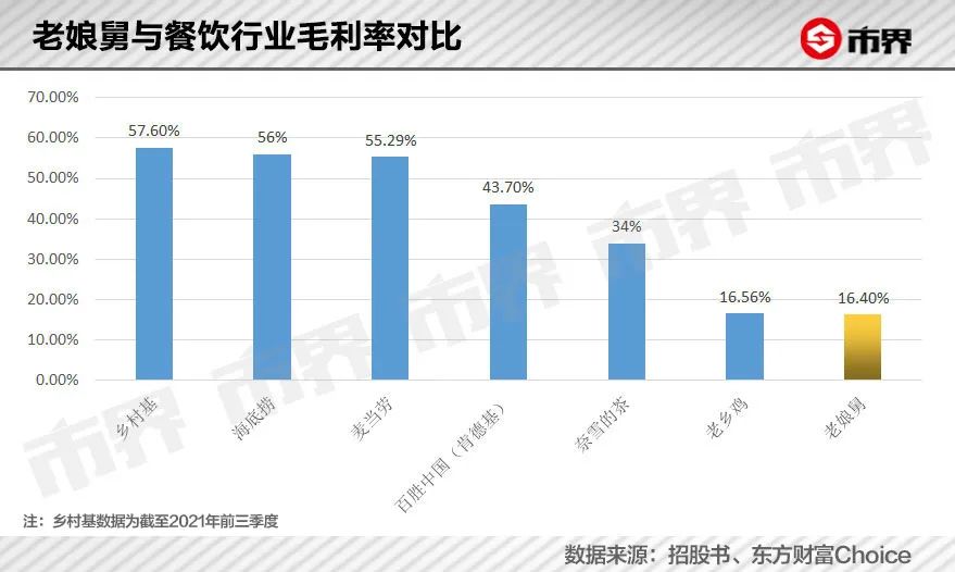 老娘舅16.4%的毛利率水平,不仅远低于麦当劳肯德基,在整个餐饮赛道来说,都不算高,比如海底捞的毛利率为56%,周黑鸭为57%,就连奈雪的茶2021年也有34%的毛利率。