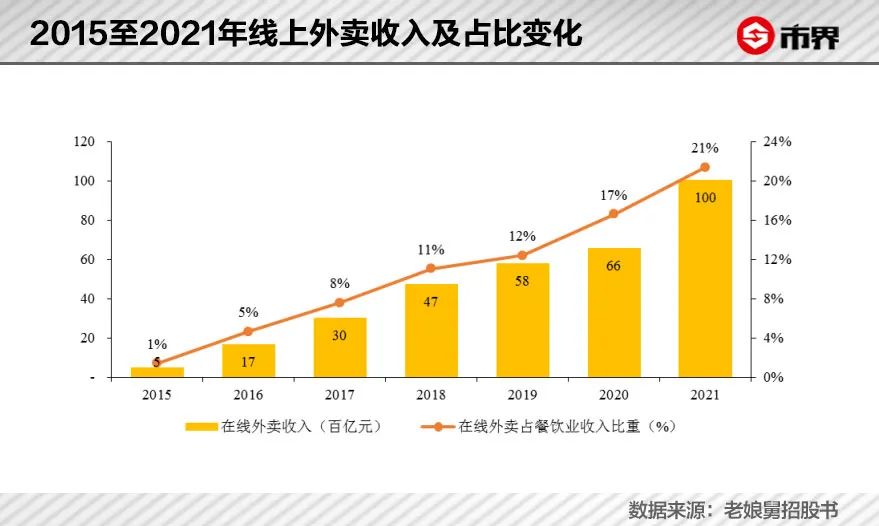 中式快餐迎来上市潮的基础也在于通过中央厨房以及预制菜的形式已经基本解决产品“标准化”的痛点。此外,受益于年轻人的线上消费倾向,外卖行业不断快速增长,2021年在线外卖收入已占全国餐饮业收入比重约为21.4%。