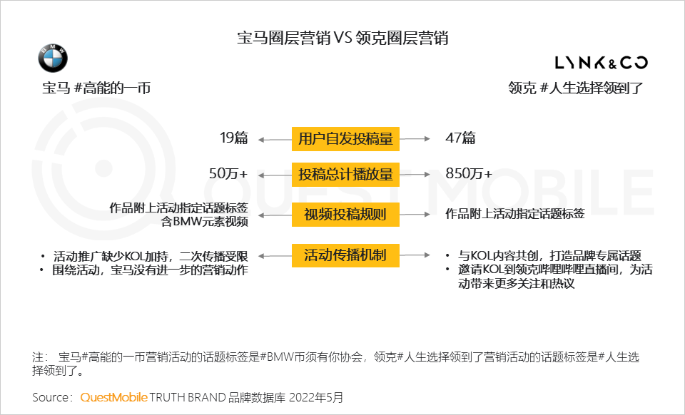 反观领克在哔哩哔哩站内的营销玩法,因降低了投稿门槛,调起了年轻人内容共创的积极性。除此之外,与KOL的合作进一步扩大了活动影响力。