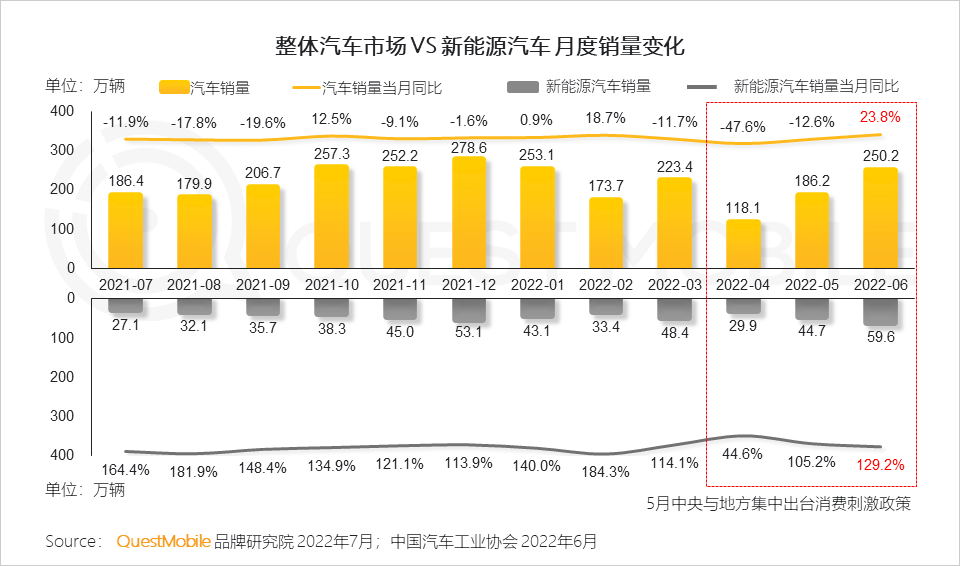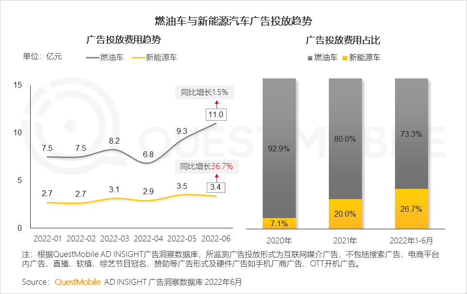 据QuestMobile数据显示,2022年6月,新能源汽车广告投放费用同比增长36.7%。