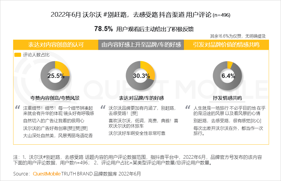 1.3 【沃尔沃】通过旅途故事叙述+唯美风景拍摄,将品牌主张的价值观融入其中,赢得了一波好评之余,也提升了沃尔沃在用户间的口碑,高雅、有内涵、安全为主要提及