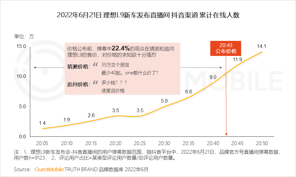 2.4 超14万的用户涌入抖音直播间;在理想L9售价公布前,价格成为直播间的热议话题,超2成弹幕为价格讨论