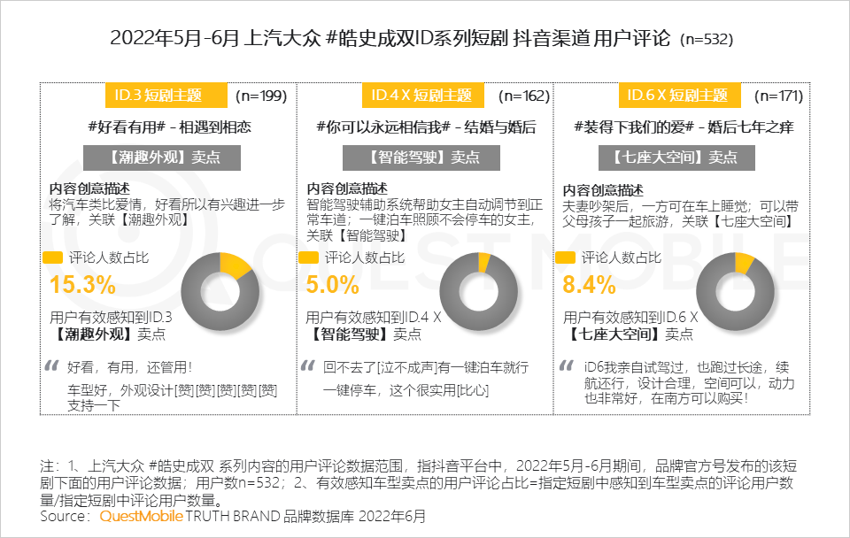 1.5 此外,不同系列的车型亮点在故事中的巧妙植入,也在用户间形成了一定的有效传递;ID.3的【潮趣外观】卖点被用户主动提及最多