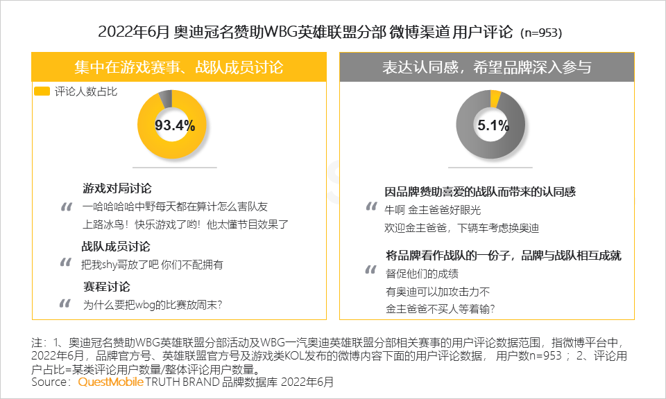 3、【奥迪】以冠名赞助WBG战队的跨界形式走近年轻人,但微博上大量的用户声音仍聚焦在战队和赛事本身,作为赞助商的奥迪仅有少量提及