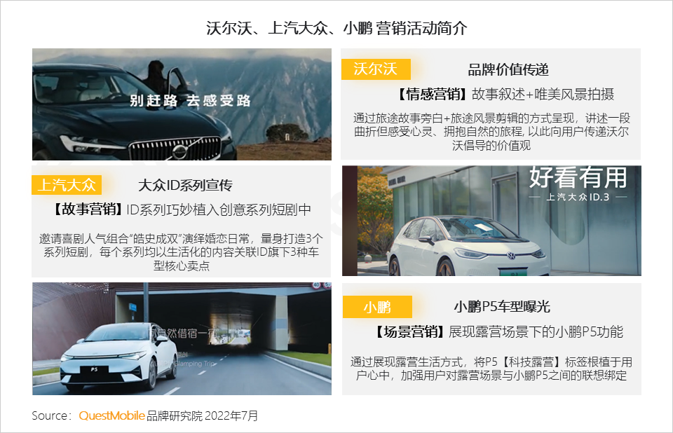 1、以短视频为载体的内容营销1.1 【沃尔沃、上汽大众、小鹏】营销策略:以内容唤起用户联想,建立情感关联,从而传递车型卖点及品牌价值