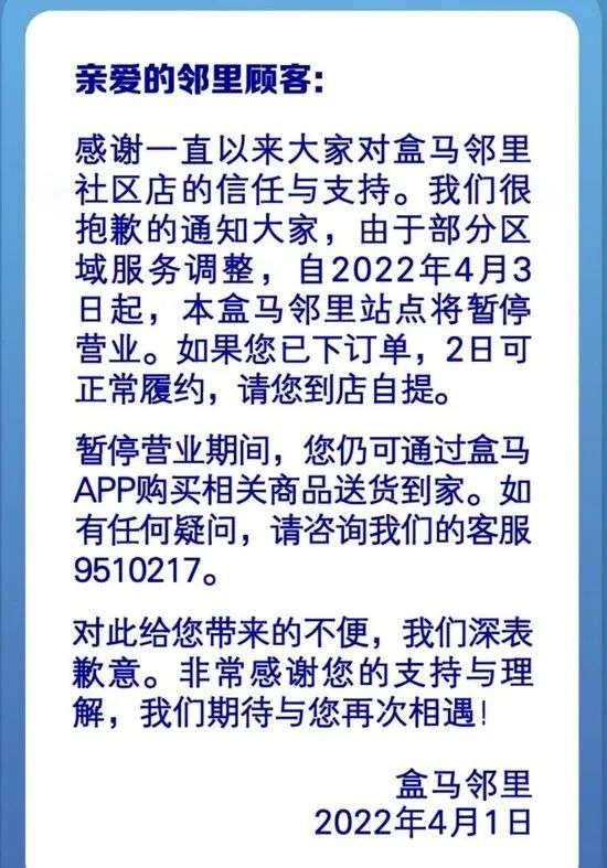 2022年4月1日,盒马APP首页挂出通告