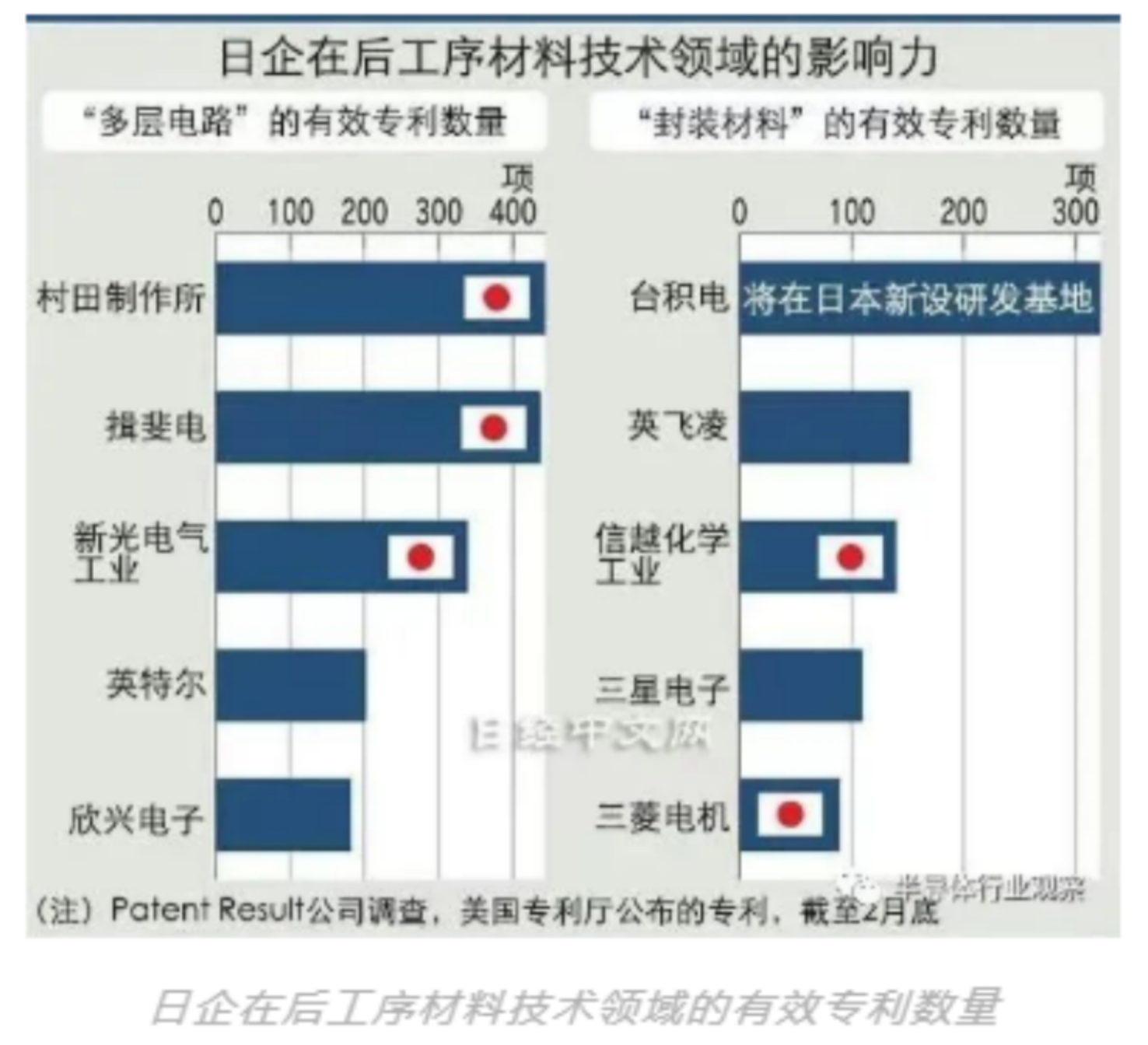 在后制程的代表性材料技术“多层电路”、“封装材料”的有效专利数量方面,专利调查公司Patent Result有统计显示:与推进后制程技术研发的台积电和英特尔一起排在前列的日本企业有信越化学、IBIDEN及新光电气工业等。
