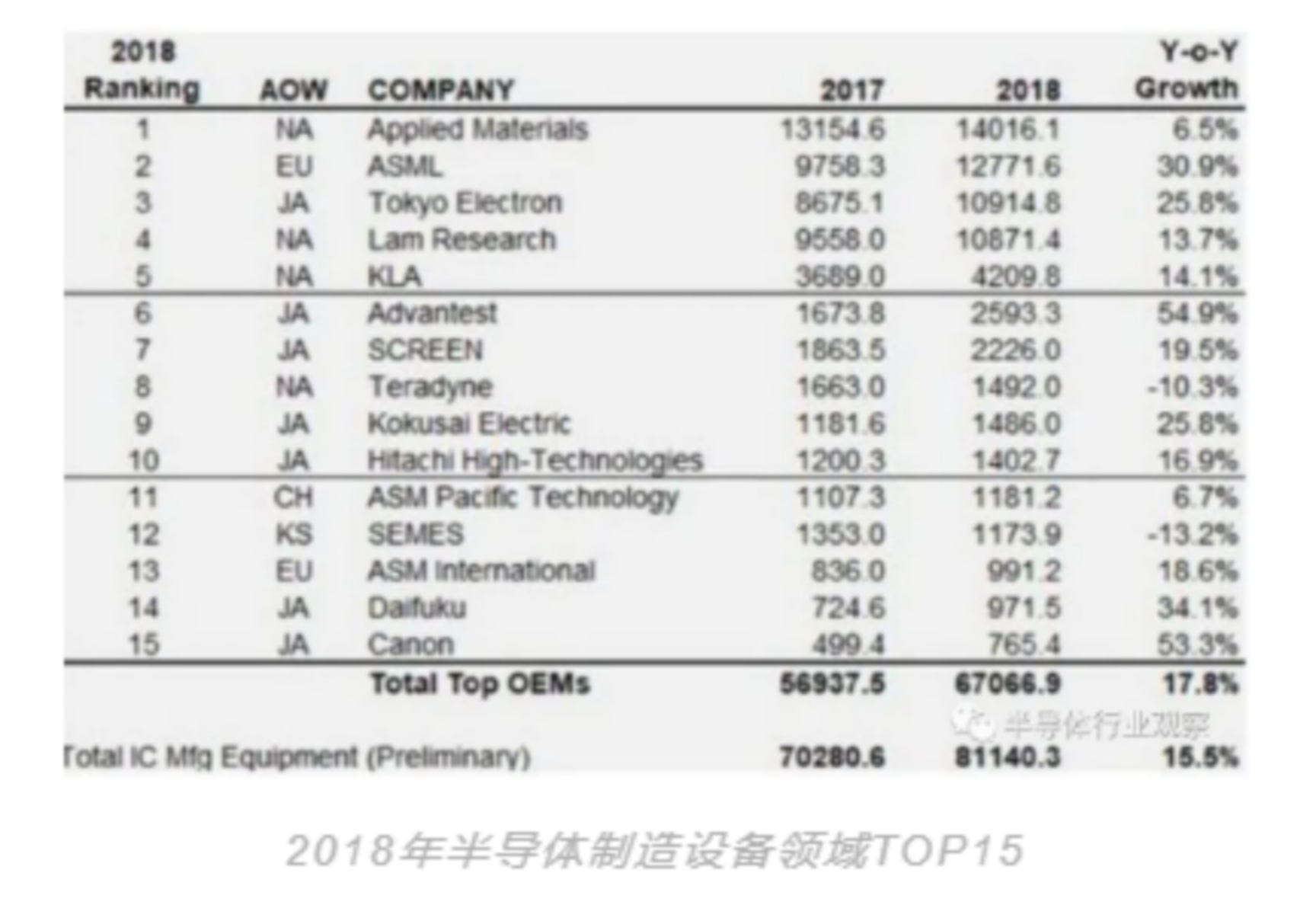 此外,还有很多日本企业在制造设备方面存在优势。2018年,半导体制造设备领域TOP15的企业里几乎有一半是日本企业。