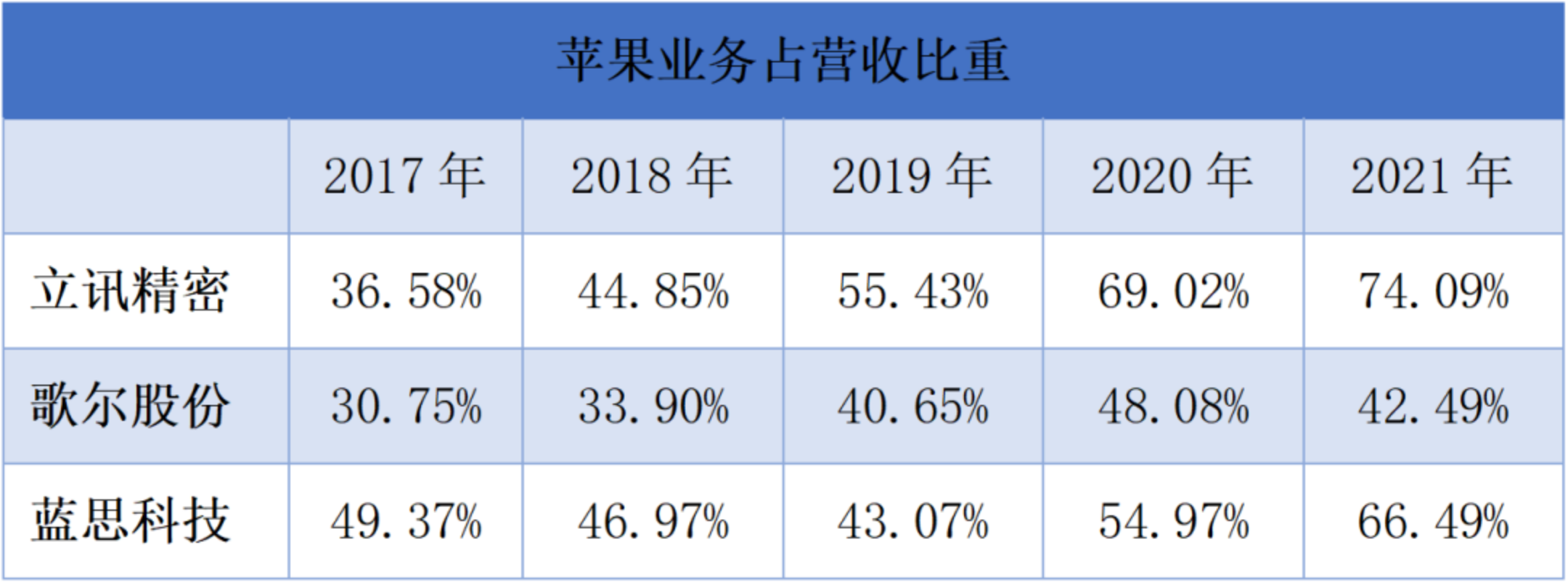 就这样立讯精密苹果业务的销售份额占总营收的比重也从2017年的36.58%一路攀升至2021年的74.09%,可以说立讯精密完全成为为苹果而生的企业。蓝思科技与歌尔股份虽稍显逊色,但苹果业务的销售份额占总营收的比重在2021年也分别达到了66.49%和42.49%。