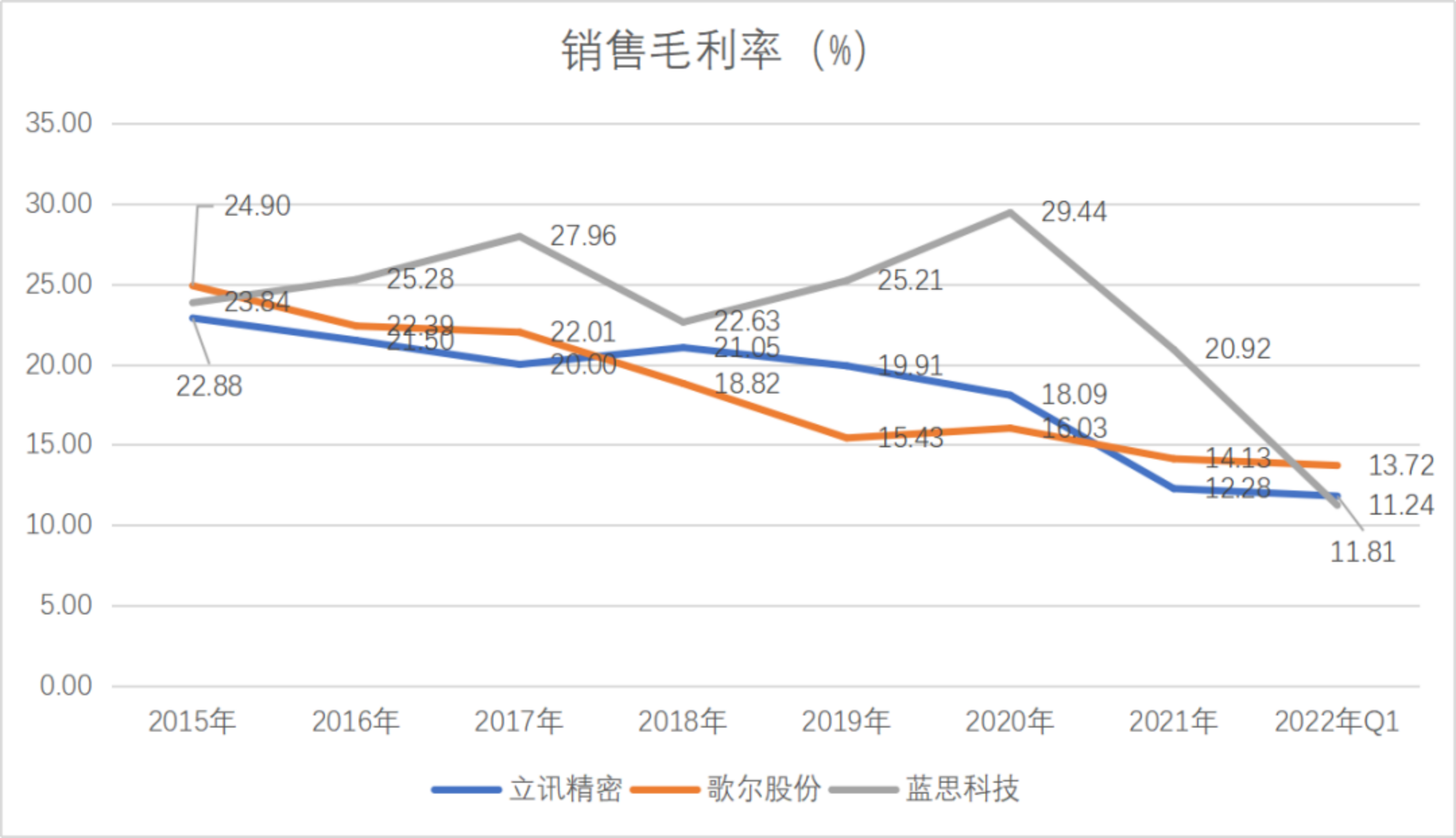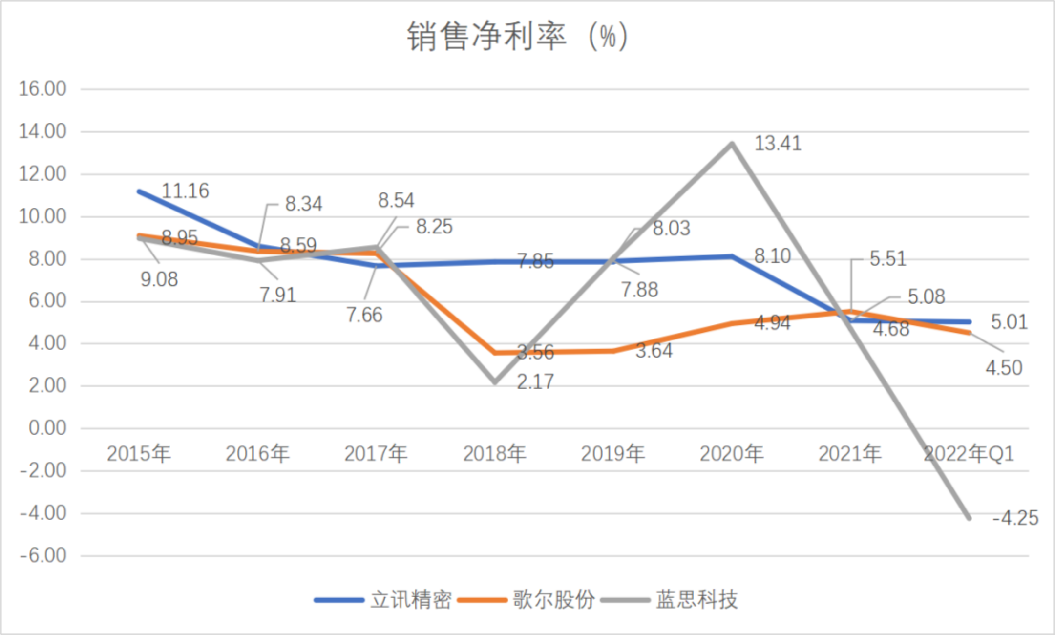 苹果作为全球硬件的领头羊,其市值已经高达2.25万亿美元,是A股果链总市值的6倍,而苹果的盈利能力更是果链企业望尘莫及,2015年以来苹果的销售毛利率保持在40%左右,而销售净利率保持在20%以上,近几年有明显上升趋势,反观我们的果链,以“果链三剑客”,即立讯精密、歌尔股份、蓝思科技为例,赚的却是实打实的“血汗钱”。