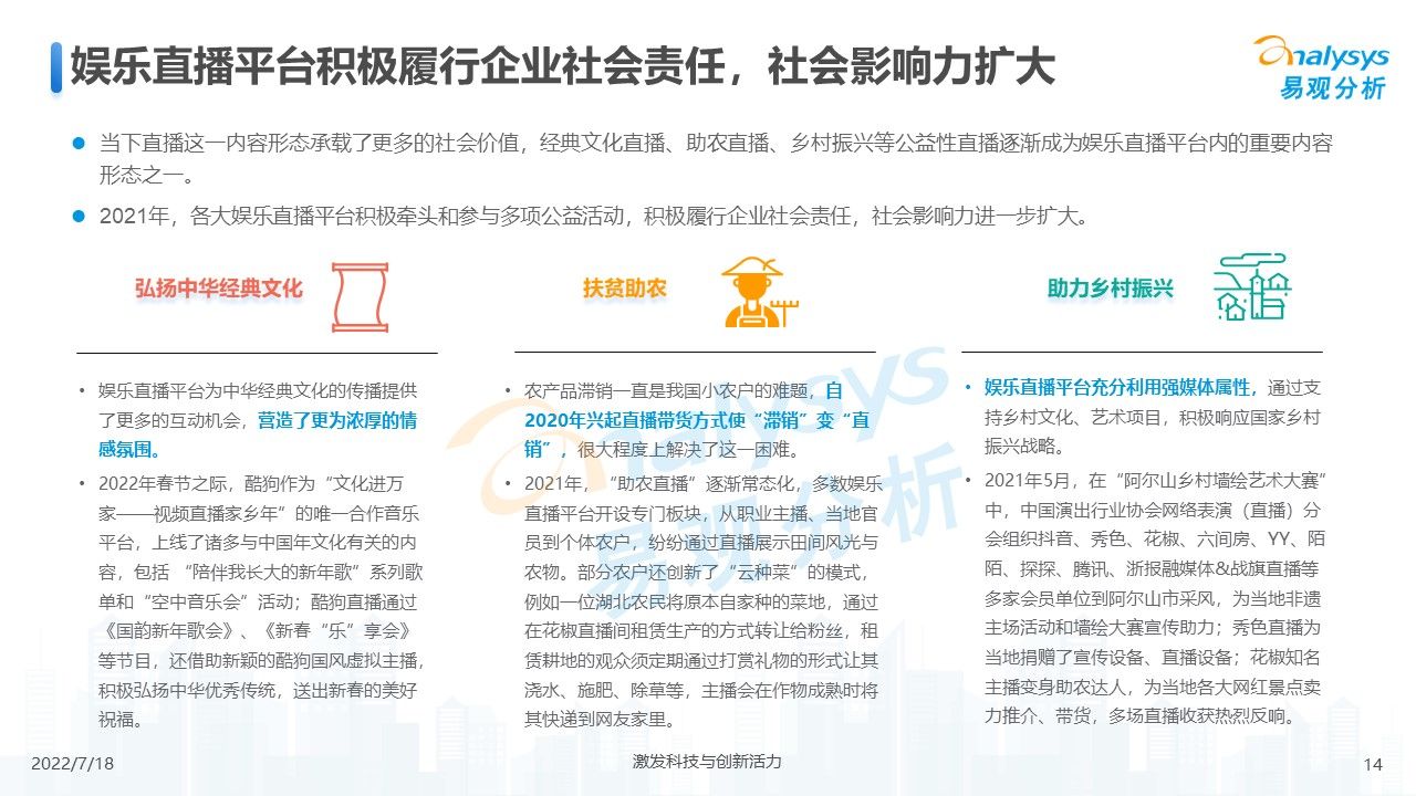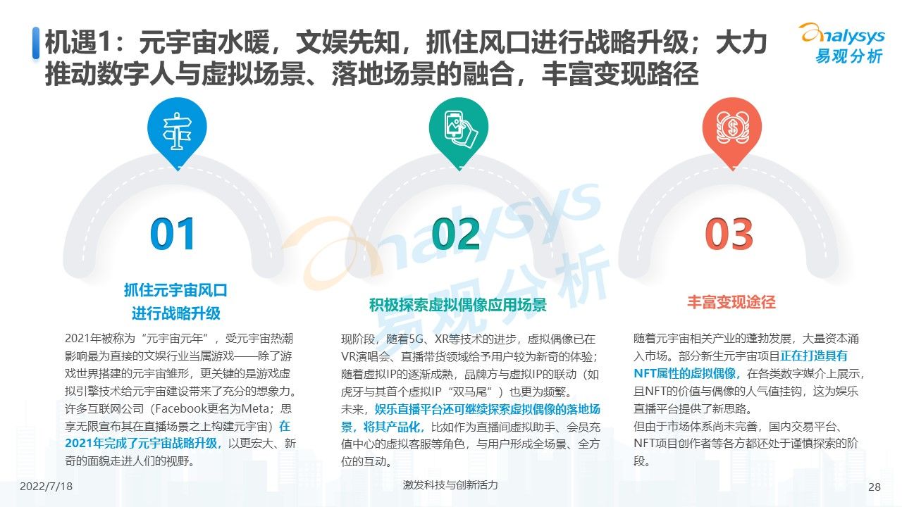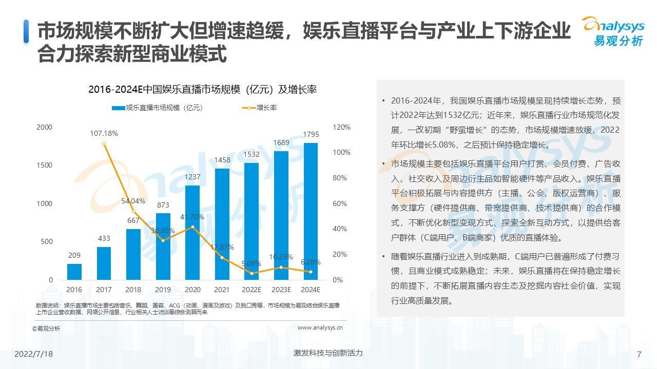 文|易观分析在国民消费水平持续提高、系列规范网络直播环境政策发布、5G、XR技术持续丰富用户体验等因素的驱动下,中国娱乐直播行业已进入成熟期,娱乐直播内容的承载力不断提升,线上线下联动、“直播+”已成为行业标配,“元宇宙”含量较高。