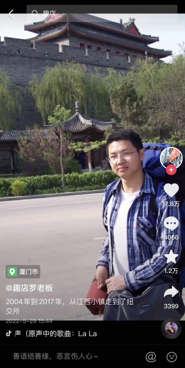 在关于罗敏的报道中,对他的描述是来自四线城市毕业于三流大学。而这也是罗敏在抖音正在打造的小镇做题家成功者人设——北漂,连续创业,赴美上市。