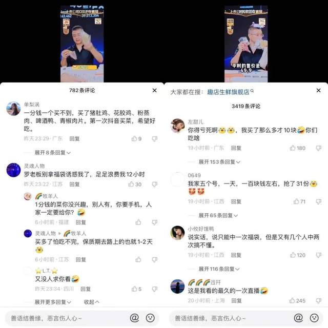 搞过校园贷、做过奢侈品电商的罗敏,如今转战预制菜,在抖音直播的时代风口上又一次展现了自己拿捏人性的能力。在“趣店罗老板”视频切片和抖音小店商品的评论下,抢一分钱酸菜鱼、抢 iPhone 13 的留言比比皆是。俨然一场“薅羊毛”的狂欢。