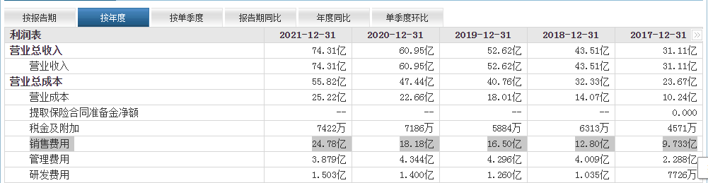 而与之相反的是,汤臣倍健的销售费用却在近年来不断高涨,如在2021年财报中,其销售费用高达24.78亿元,占收入比重也首次达到了33.35%。