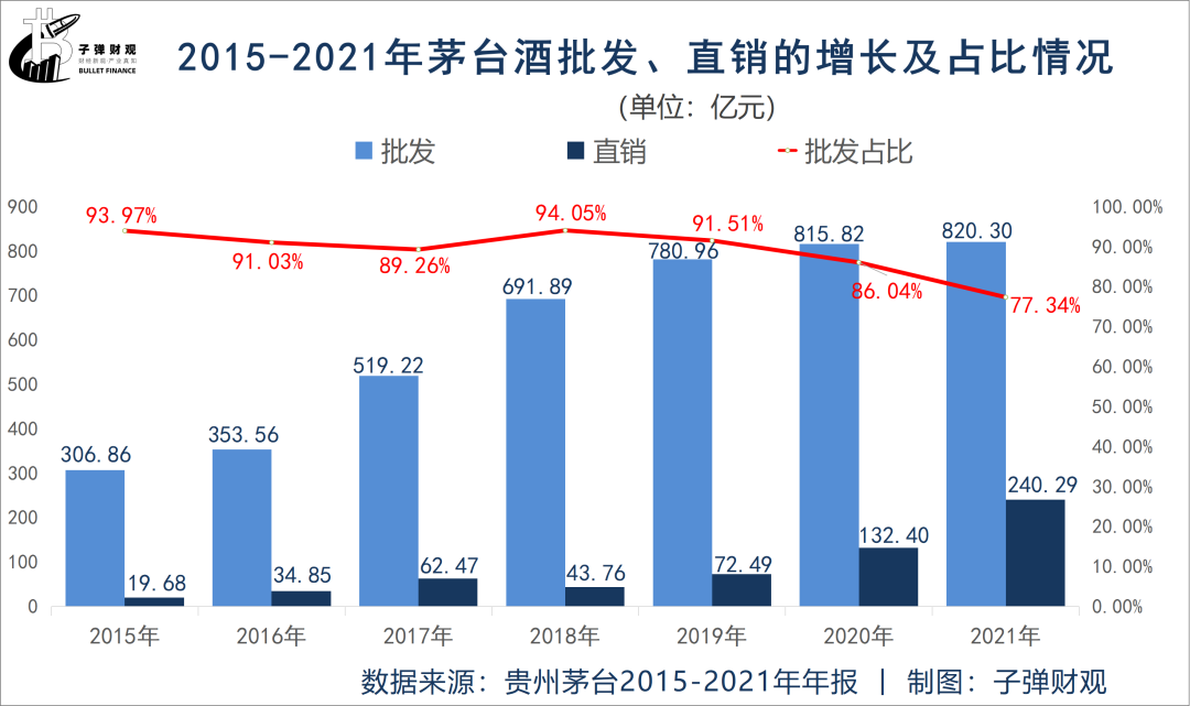 在梳理茅台和经销商的关系时,「子弹财观」发现,2015年茅台的主营业务茅台酒实现了326.54亿元的销售收入,其中批发代理的形式贡献了306.86亿元,占总销售收入的93.97%。而到了2021年,茅台酒已经实现了1060.59亿元的销售收入,其中批发代理的形式贡献了820.30亿元,占总销售收入的77.34%。