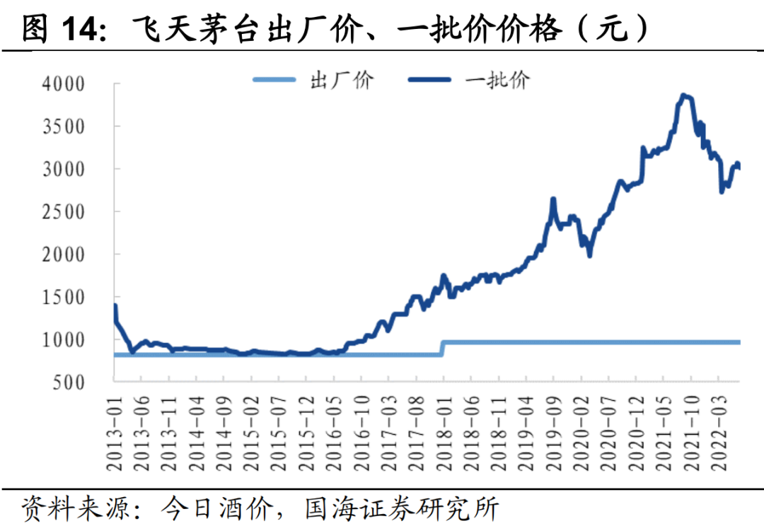 与批发价相对应的出厂价,在过去十年里仅于2018年1月9日有过一次调价,且随后的五年里未曾出现过涨价,而这五年里飞天茅台的一批价已经从1500元/瓶上涨至3000元/瓶,整箱装售价曾一度上涨至4000元/瓶。
