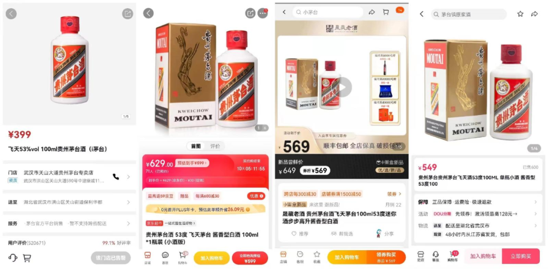 这款产品在“i茅台”APP的抢购价格是399元/瓶,且有着超过50万的评价数量;而同款小酒在京东某酒网旗舰店的限时抢购价为599元/瓶,在天猫某藏酒专营店的折后价为569元/瓶(天猫超市125ML装卖到了968元/瓶),在抖音电商直播间卖549元/瓶。