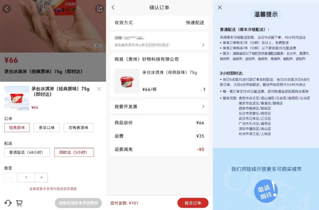 「子弹财观」下载“i茅台”App并注册了账号,试图购买茅台冰淇淋。在设定好收货地址后,发现3小时“及时达”服务无法配送,48小时“普通派送”还得收35元的运费。关键的是,收货地址位于武汉市的中心城区洪山区,距离茅台冰淇淋武汉恒隆广场旗舰店的距离也就15公里。