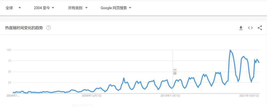 图为Google Trends显示的e-bike全球搜索热度变化趋势:自2012年开始稳步增长,到2020年后迎来井喷式增长
