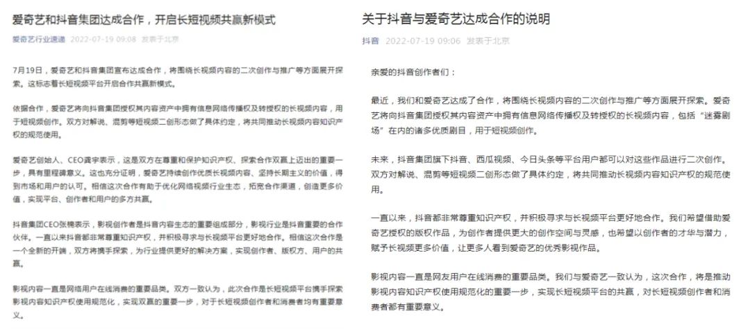 爱奇艺和抖音的公告里都特别提到了“双方对解说、混剪等短视频二创形态做了具体约定,将共同推动长视频内容知识产权的规范使用”。而这也意味着,双方将在满足短视频用户、留住长视频用户之间尝试达成平衡。