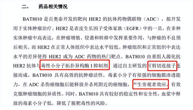 很有意思的是,就在几天之前,百奥泰就公告另一款聚焦于HER-2靶点的ADC药物BAT8010获得临床批复,而BAT8010最大的改变就是采用与DS-8201类似的拓扑异构酶 I 抑制剂载药和可裂解连接子,且能够有效产生“旁观者效应”。