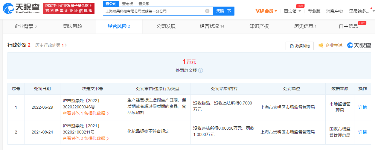 天眼查显示,上海芯果科技有限公司崇明第一分公司,成立于2020年11月20日,负责人为顾晓健,上海芯果科技有限公司为该公司总公司。值得一提的是,近两年该公司还曾因化妆品标签不符合规定,生产、经营说明书、标签不符合规定的医疗器械被行政处罚。
