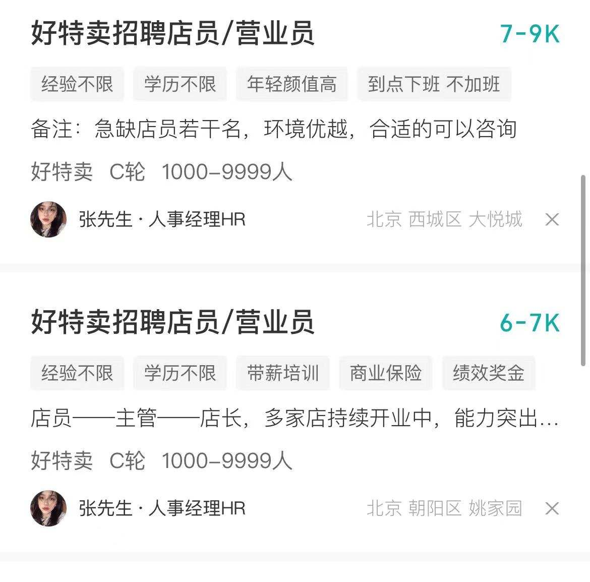 但在分成中还包含了人工和水电成本,根据Boss直聘显示,好特卖在招的店员薪资为6-9k,按照一个门店2名店员的配置,每个月光是人工成本就需要12k-18k,刨除人工成本,加上水电费支出,每月到手分红最多7万多元,最少仅有1万多元,而且还是两位合伙人的共同分成,简直就是变相打工。