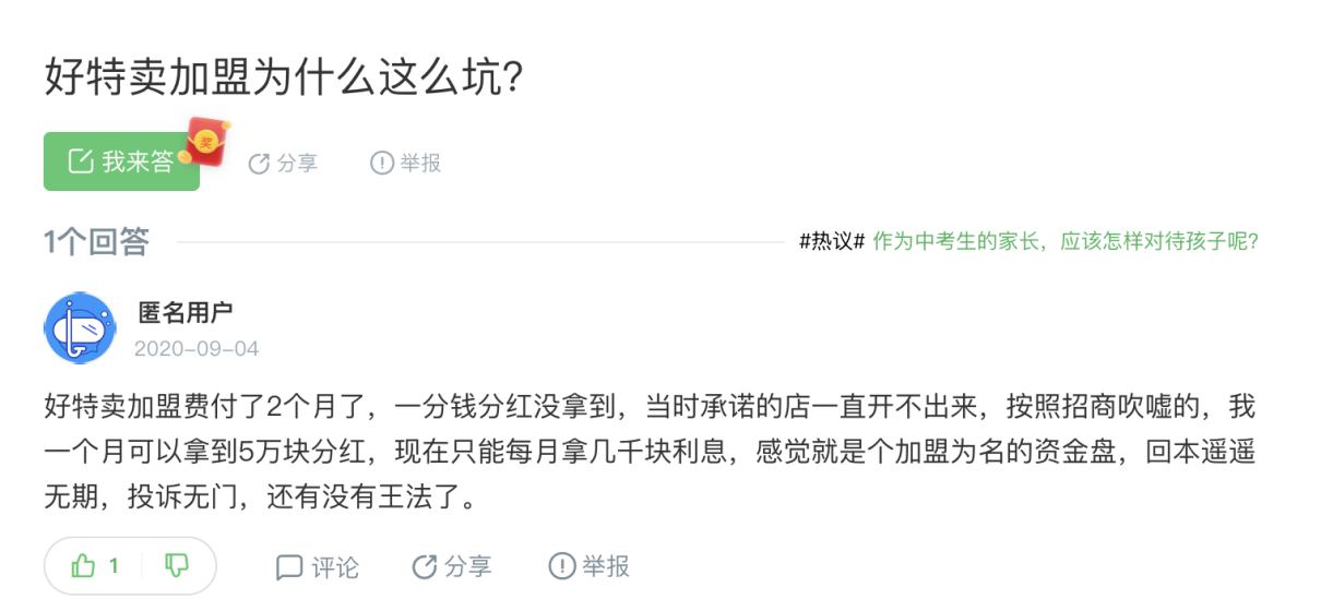 据财经网产经报道,此前好特卖加盟费高达88万元。更早前,有网友爆料称,加盟好特卖2个月,一分钱分红没拿到,当初承诺一个月可以分红5万,现在只能每月拿几千块利息,好特卖就像是个以加盟为名的资金盘 。