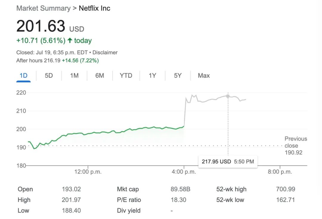 由于各项数据均好于预期,盘后Netflix的股价涨幅一度超过了10%,股价重新站上了200美元大关。