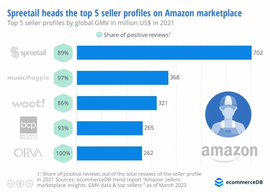 这就是美国的在线零售商Spreetail,ecommerceDB数据显示,2021年Spreetail的全球年销售额为7.02亿美元,在亚马逊上产生的销售额几乎是排名第二的musicMagpie的两倍。