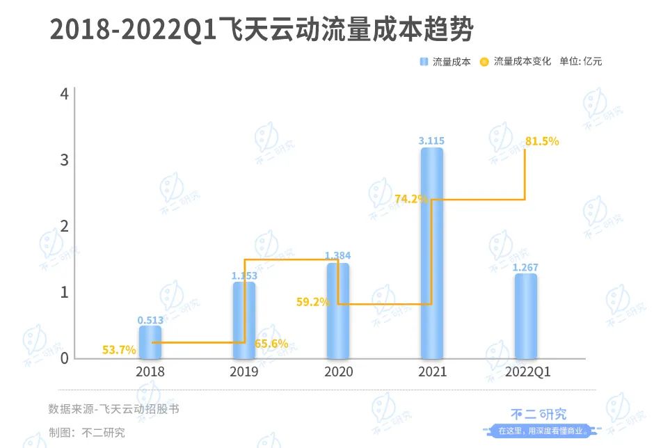 据招股书披露,2018-2021年及2022第一季度,飞天云动的流量获取成本分别为0.513亿、1.153亿、1.384亿、3.115亿、1.267亿元,同期总收入成本占比高达53.7%、65.6%、59.2%、74.2%、81.5%。