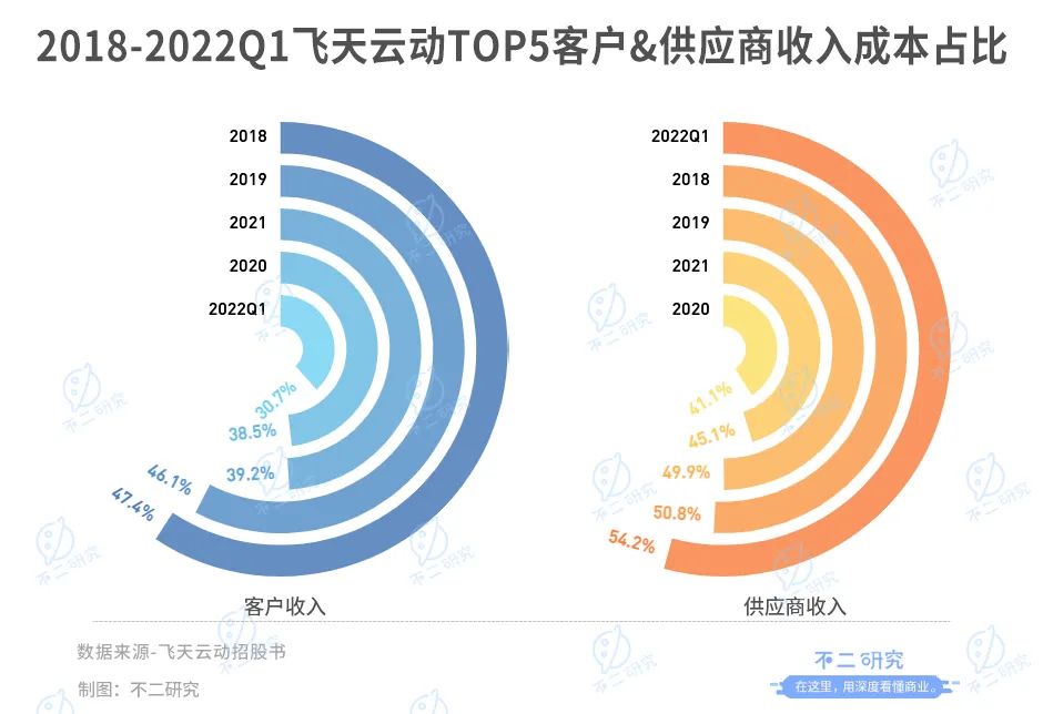2018-2021年及2022第一季度,飞天云动TOP5客户收入在当期营收占比47.4%、46.1%、38.5%、39.2%及30.7%;同期,TOP5供应商在总收入成本占比约50.8%、49.9%、41.1%、45.1%及54.2%。