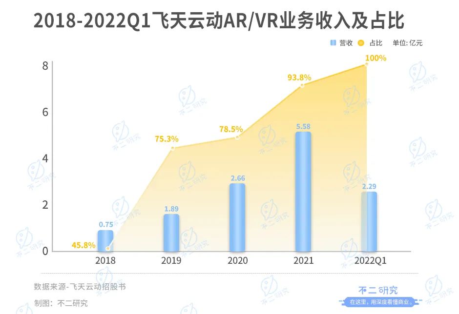 2018-2021年及2022第一季度,来自AR/VR业务的收入为7514.9万、18894.0万、26569.7万、55832.4万、22878.1万元;当期营收占比45.8%、75.3%、78.5%、93.8%及100%,从2019年起逐渐一家独大。