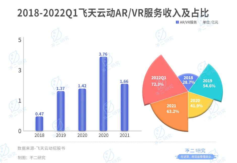 2018-2021年及2022第一季度,来自AR/VR服务的收入为4710.2万、13710.3万、14170.1万、37634.1万及16557.4万元,当期营收占比28.7%、54.6%、41.9%、63.2%及72.3%。