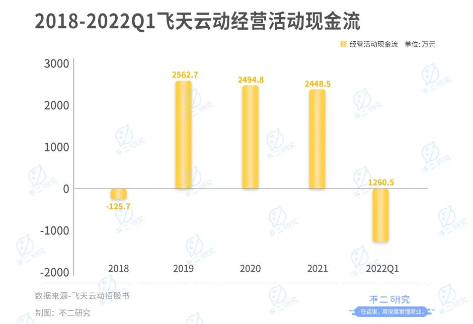 但是,「不二研究」发现,飞天云动经营活动所得的现金流却有起伏:2018-2021年分别为-125.7万、2562.7万、2494.8万、2448.5万元;2021年第一季度及2022第一季度为-1108.5万元、-1260.5万元。