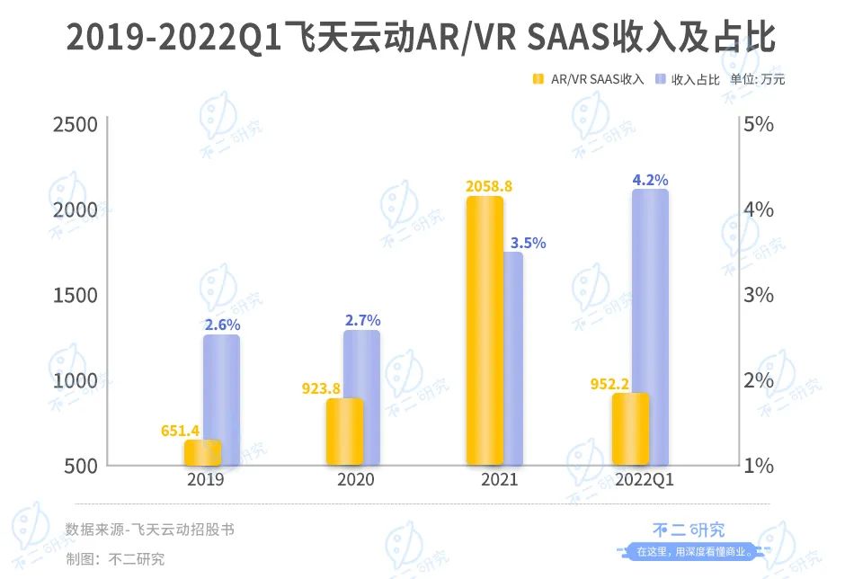 2019-2021年及2022第一季度,来自AR/VR SaaS收入分别为651.4万、923.8万、2058.8万及952.2万元,当期营收占比2.6%、2.7%、3.5%、4.2%。