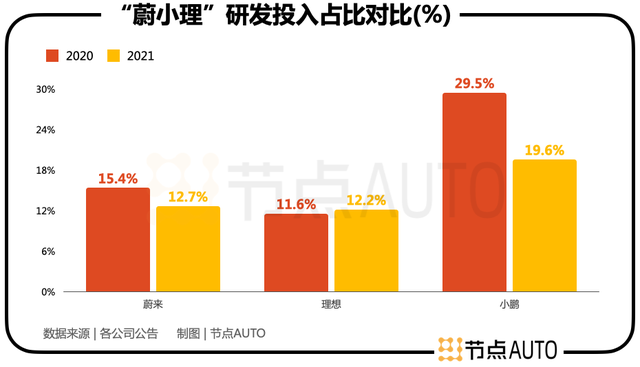 观察小鹏的研发力度,最重要的是要看研发投入的占比,因为小鹏的产品结构导致其收入规模要低于蔚来和理想,研发投入占比更能看出企业的战略重点在何处。