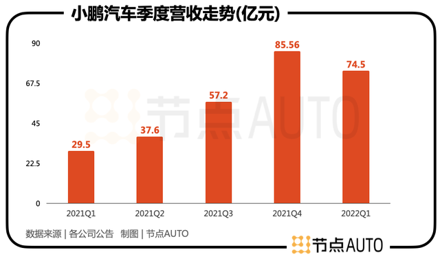 目前,小鹏的收入来源分为汽车销售和其他两部分,其中汽车销售占到95%以上。小鹏的营收规模在2021年Q1还只有29.5亿元(人民币,下同),到2022年Q1已经增长至74.5亿元,翻了2.52倍,在此期间的季度增速一直保持在150%以上。