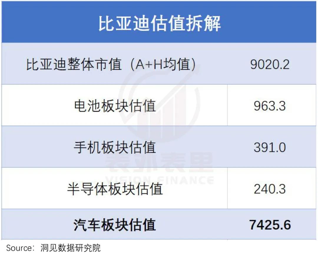 我们拆解比亚迪的业务构成(如下图),按分部估值法测算得出,比亚迪汽车板块对应的估值约7425亿。