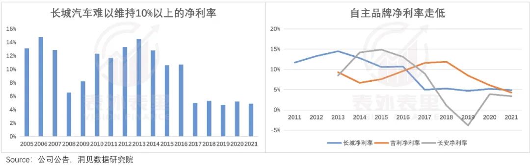 而国内自主品牌,净利率表现相对较好的是长城汽车,2005-2021的16年里,净利率超过10%的有10年。