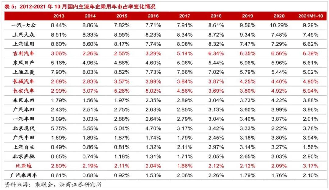 但从当下的中国市场来看,2013年至今,国内主流车企乘用车市占率变化显示,细分品牌中只有一汽大众在2020年的市占率超过了10%,且仅一年,其市占率又再次回到10%以下。