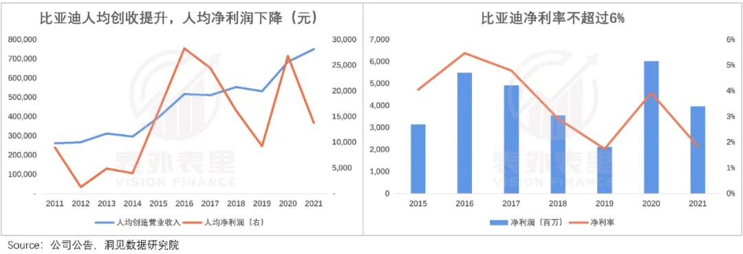 如此可能带来的是,职工人数规模在增长,但人均效益却并没有明显提升。如下图,比亚迪2021年的人均创造净利润,不升反降。