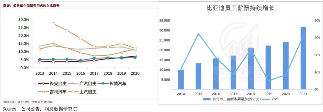 比亚迪也不例外,2021年其职工薪酬同比增速达到31%。