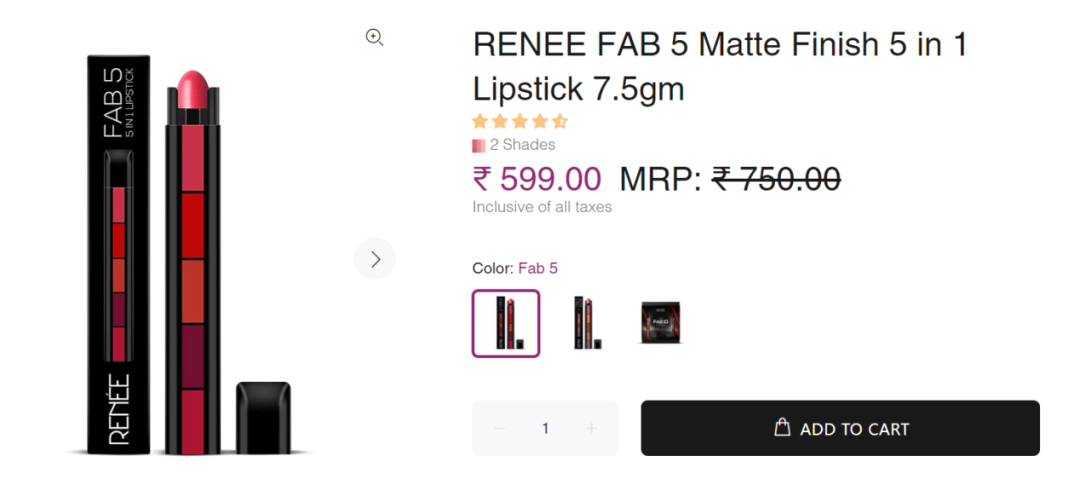 另一个来自印度的美妆品牌 Renee,主打的是创意型美妆以及高性价比。Renee 的产品创新在于,品牌发布了几款色彩甚至是功能多合一的美妆产品。比如 Renee 旗下的 FAB 5 Matte Finish 5 in 1 Lipstick 这款产品,其特色就是一款口红产品有 5 种颜色,每一种颜色就像一颗小子弹一样,消费者可以将他们组装在一起随身携带,需要的时候也可以拆出想要用的那一截“子弹”使用。对于那些每个颜色都想要的姐姐们,省却了选择的烦恼。