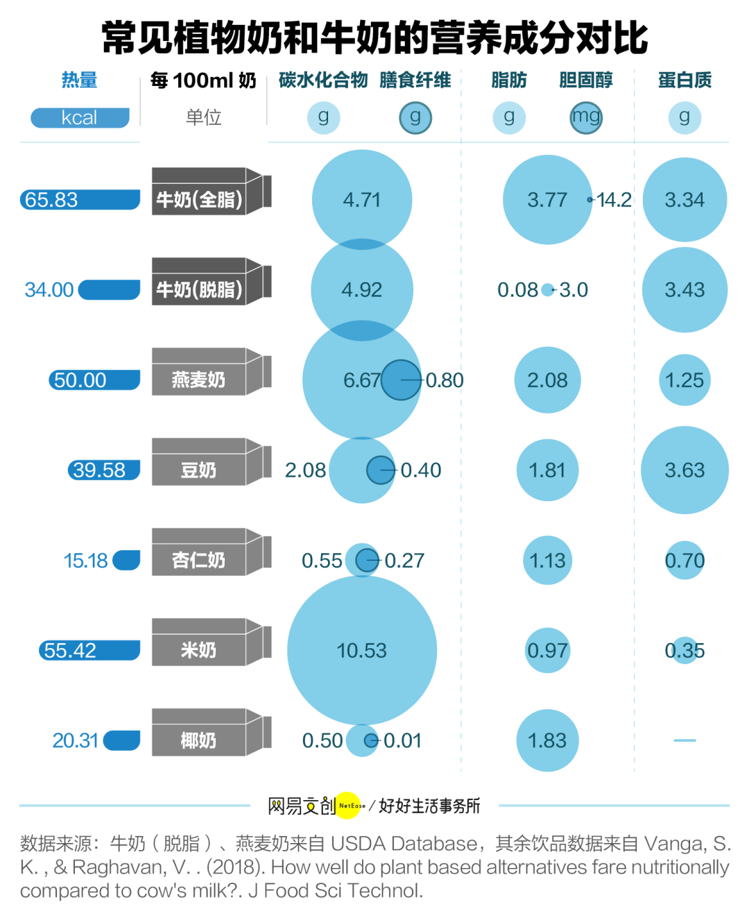 包括植物奶作为营销卖点的“低热量”,也有一些数据证明其实其并没有太大优势。正如“36氪”在文献和 USDA Database 中得到数据,在热量方面,植物奶的表现确实要比全脂牛奶低。但像是市面上最火的燕麦奶,热量并没有特别明显的优势,只比全脂牛奶低 15.83 大卡热量。燕麦奶、豆奶、米奶的脂肪和热量都超过了脱脂牛奶。