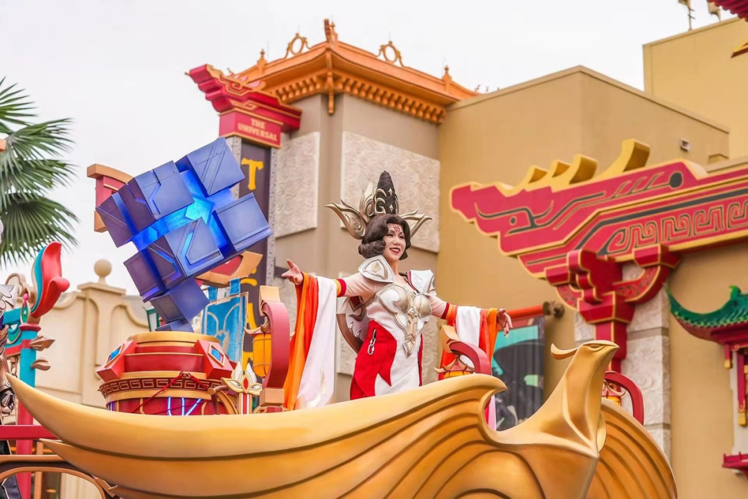 环球影城选取《王者荣耀》中「长安区域」作为故事背景,将盛唐时期的长安风貌和英雄融入花车巡游,并打造了英雄见面会以及限定周边商品等娱乐体验。
