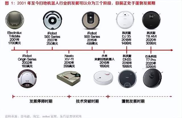 扫地机器人在大规模进入市场后,目前经历了三个阶段。2002年,iRobot 推出了搭载随机清扫算法的“Roomba Origin”系列,新颖的技术加上低至160美元/台的售价,帮助iRobot迅速占领市场份额,成为了行业领军者。